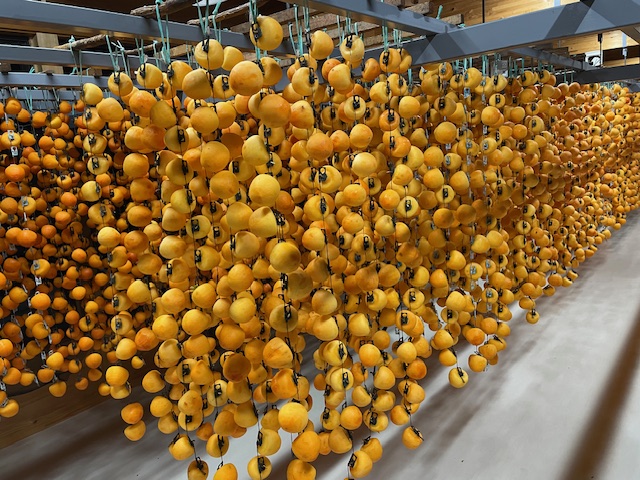 市田柿の収穫、加工作業が始まりました! 2025年10月24日 いよいよ、本日から今年の市田柿シーズンが始まりました。 今日は早速、約100コンテナを収穫し、皮むき作業を行い、のれんに吊るし、干し場に干していきました。 このように、市田柿の作業は同時に様々な作業が同時進行で行われていきます。 収穫→柿剥き→柿のれん作り→燻蒸→干し作業、収穫時期はこの一連の作業が同時並行で行われます。 これが市田柿づくりの第一段階で、11月20日頃まで続きます。 «前 次» 店長日記